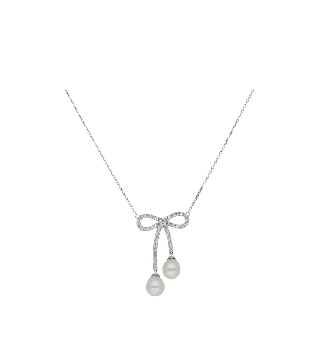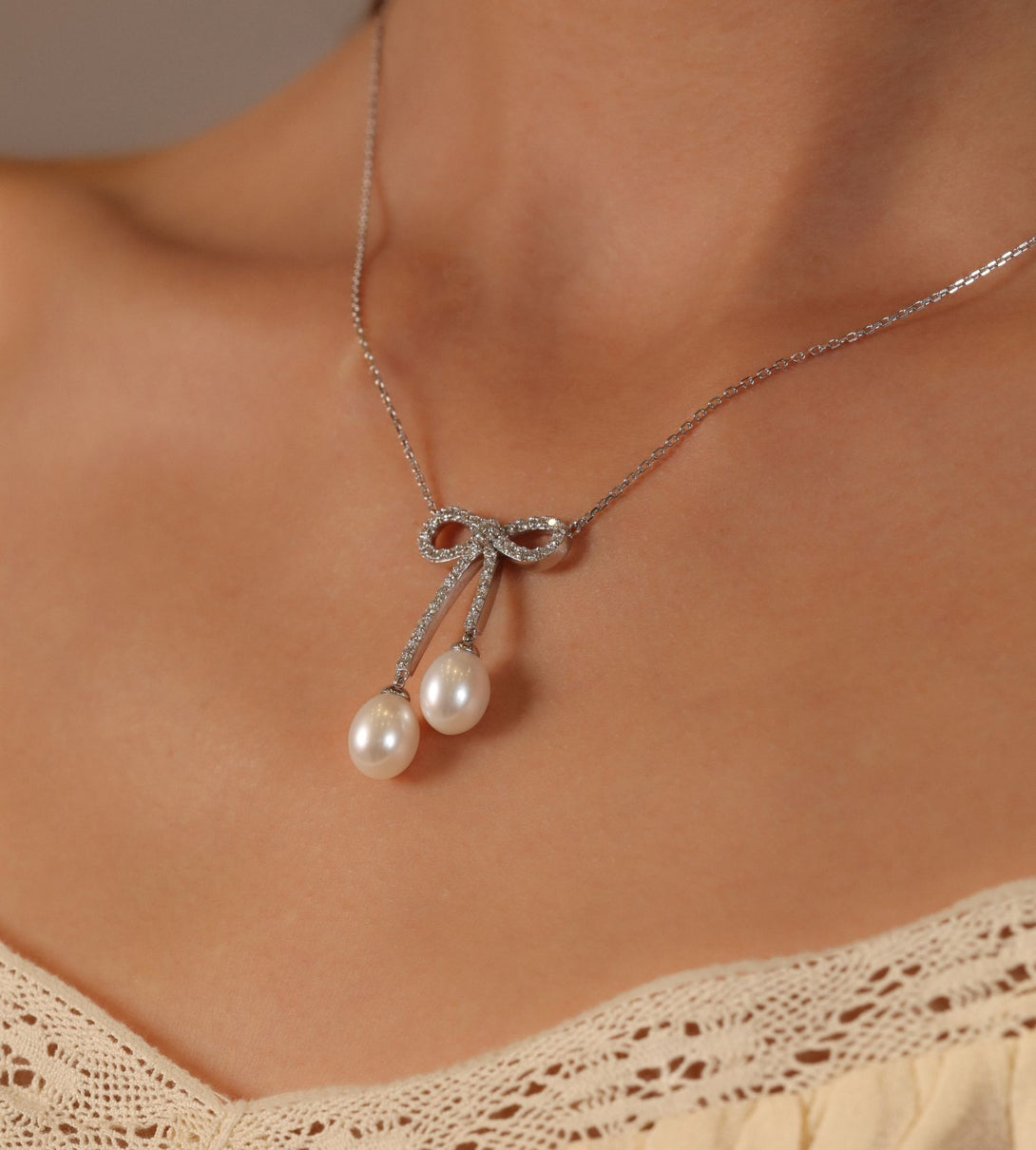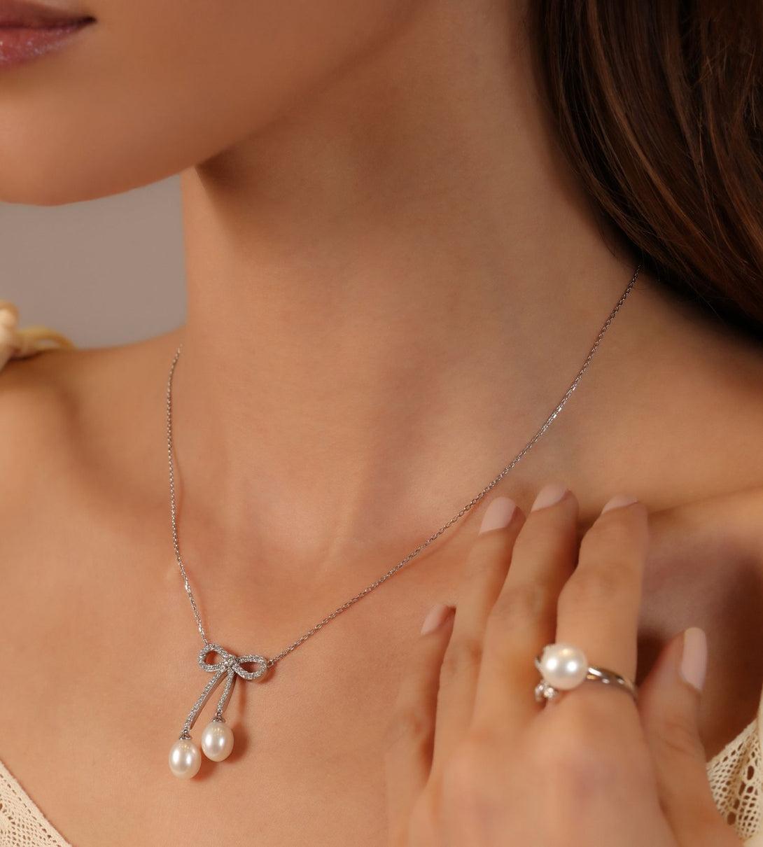 A symbol of heavenly beauty, the Elys pendant features a graceful bow crafted in sparkling diamonds and set in luxurious white gold, with a delicate drop of pearls adding a touch of sophistication. This piece is perfect for those seeking a refined, exquisite jewellery.