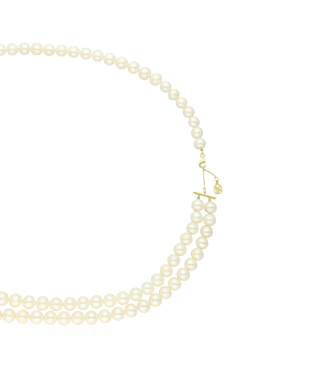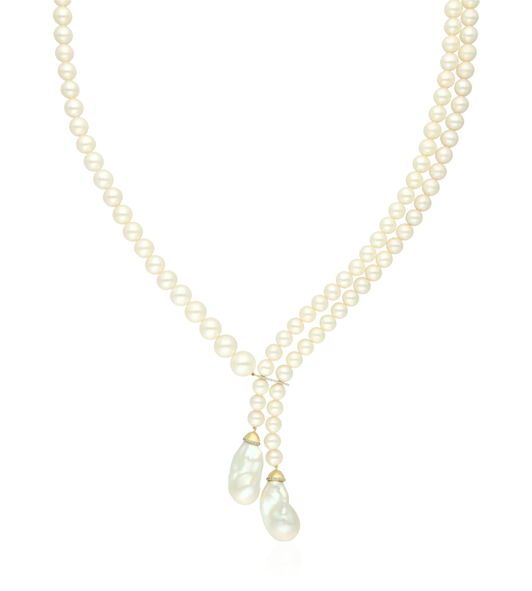 Lustrous round and baroque pearls dance on layered gold chains in an artful statement.