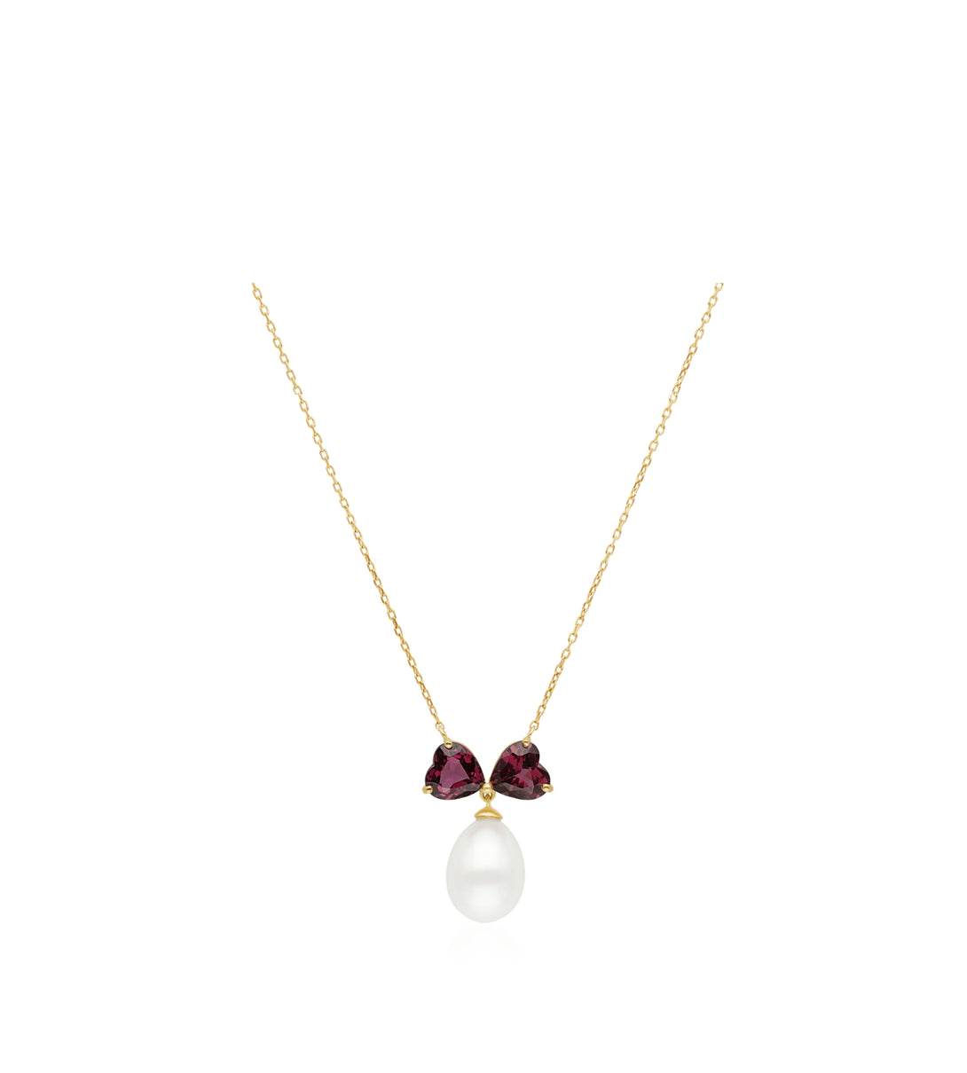 Embrace the captivating allure of love with "Red Love Bow" pendant, a delightful dance of dazzling red garnet, lustrous pearl and gleaming 18kt yellow gold.