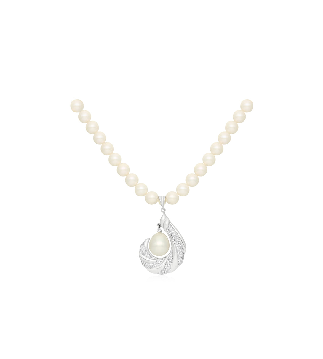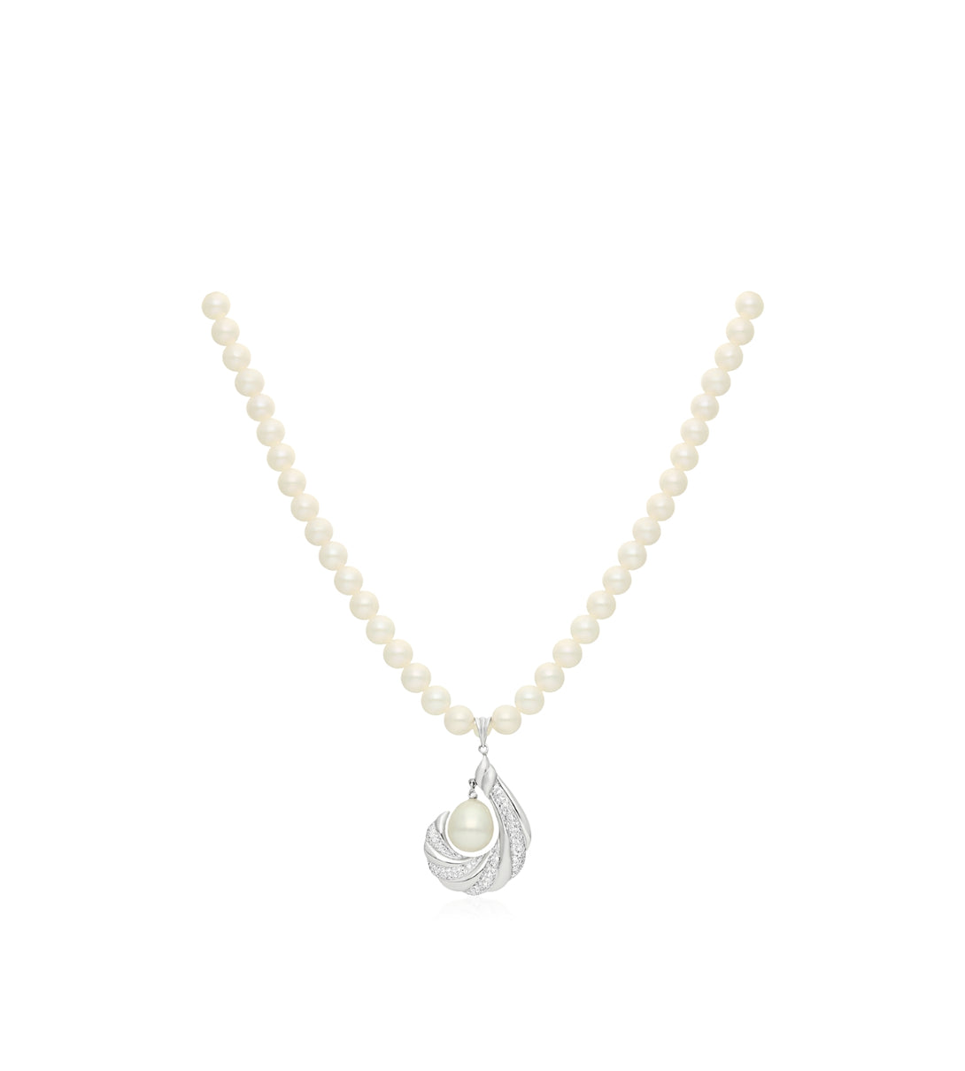 A luminous pearl strand meets a sculptural half-drop design in twisted white gold.