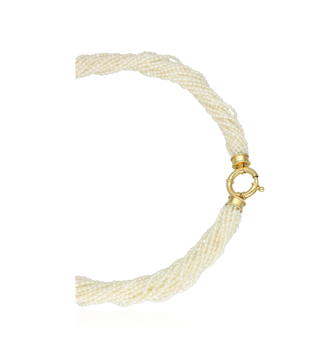 Riviera necklace, meticulously handcrafted multistrands of luminous seed pearls, elegantly twisted to form a fluid, sculptural masterpiece.